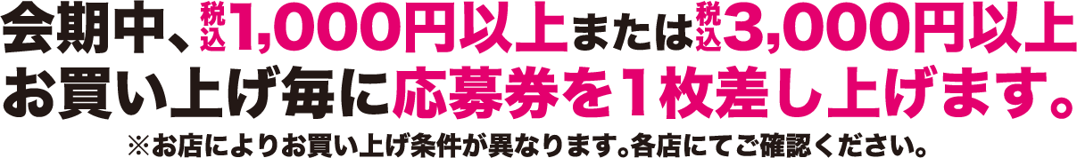 1,000円以上または3,000円以上お買い上げ毎に応募券を1枚差し上げます。